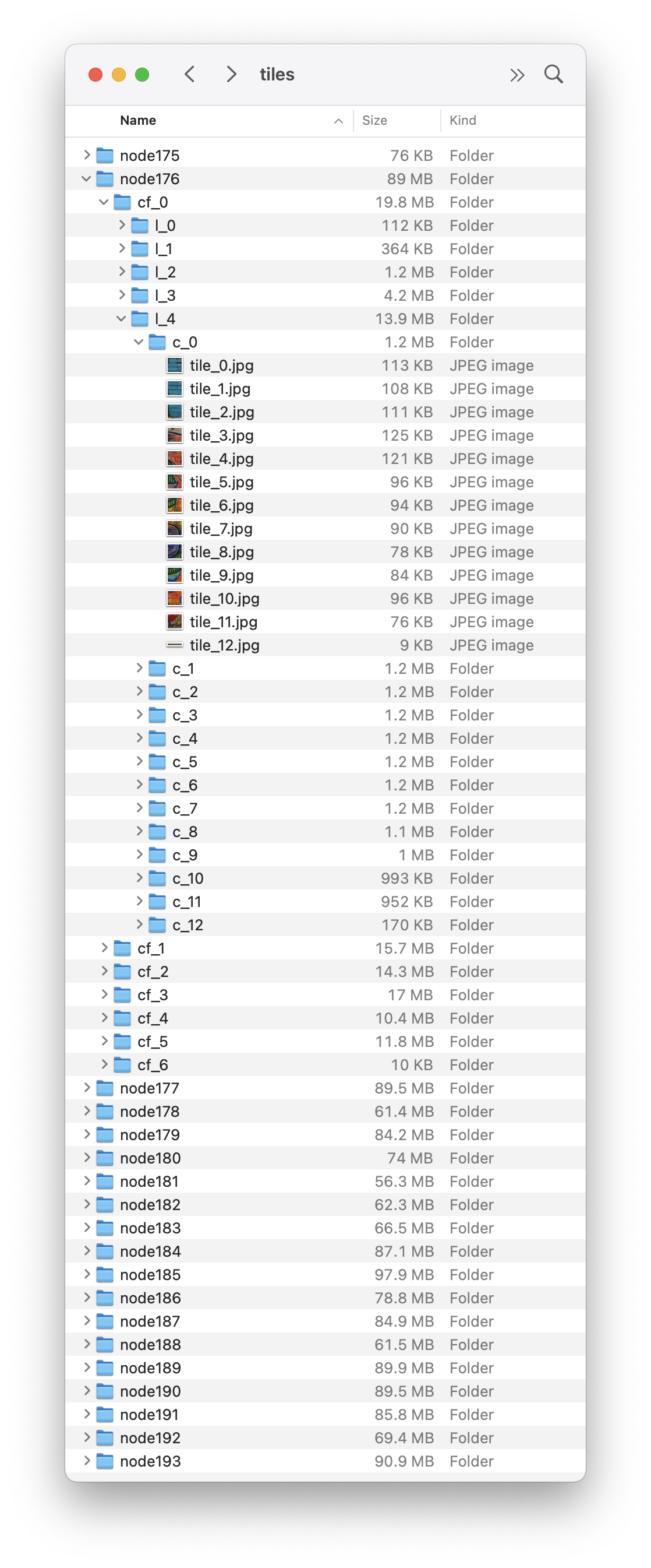 Above: Tile folders for the Adelaide Street Art tour showing Node176 > Cube Face cf_0 (front) > Level 4 (l4 and largest tile) > Column 1 (c_0) tile_0.jpg to tile_12.jpg (total number of tiles for the cube face = 169.