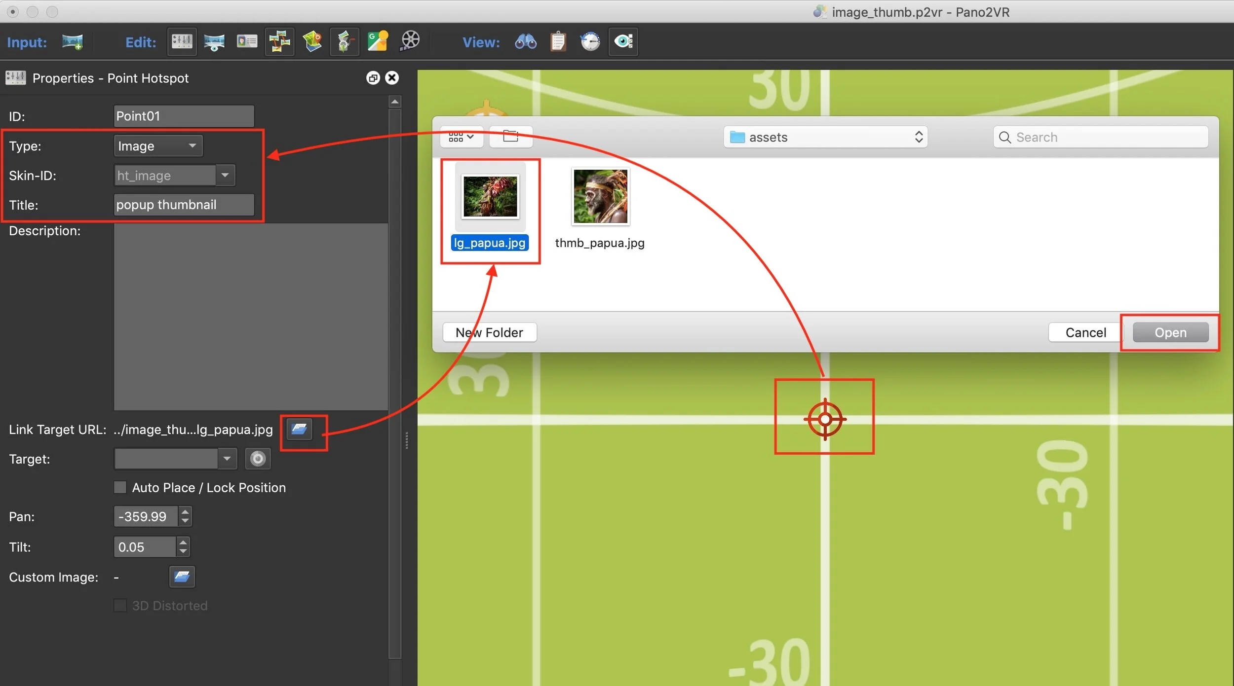 7. Add a hotspot to the panorama and set it’s type as ‘Image’. Add a Title: popup thumbnail and click on the ‘Link Target URL’ folder icon.