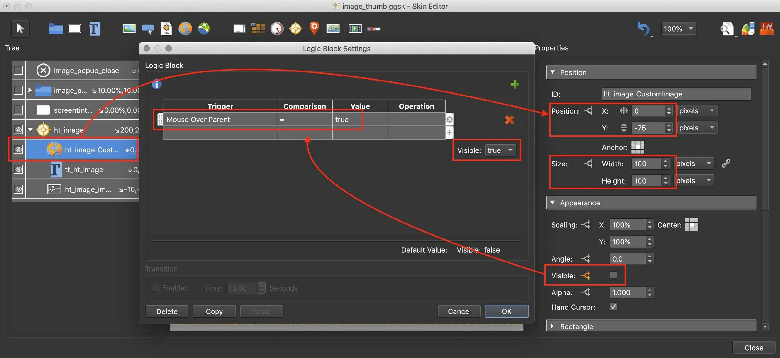 Visible: Logic Block change to: Trigger = Mouse Over Parent | Comparison = | Value = true | Visible = true (Figure #10)
