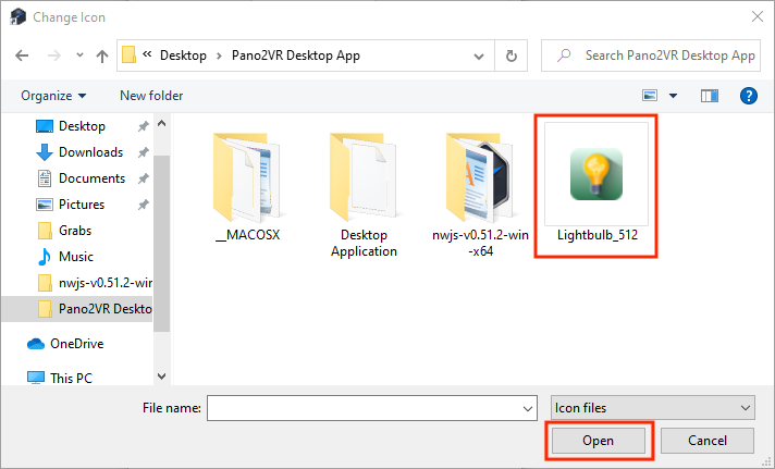 4. Select Lightbulb_512 from the Pano2VR Desktop App folder and click on Open (figure #21)