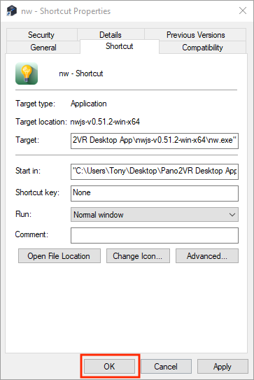 6. Click on OK to close the nw-shortcut properties window (figure #23)